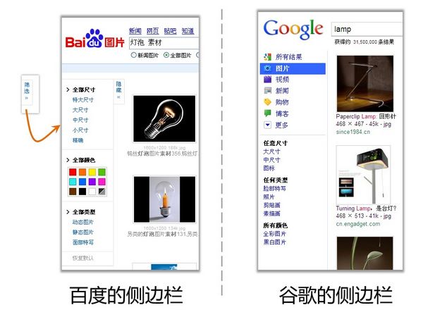 除此之外,為了改善圖片的搜索質量,百度和谷歌(ge)都(dou)有改善的側邊欄。其中百度是(shi)在搜索結(jie)果(guo)頁(ye)面(mian)的左側,有個“篩(shai)選(xuan)(xuan)”文本框(kuang),點開(kai)之后即為篩(shai)選(xuan)(xuan)選(xuan)(xuan)項欄;而谷歌(ge)則也搜索結(jie)果(guo)頁(ye)面(mian)的左側直接展開(kai)該選(xuan)(xuan)項欄。如(ru)圖3所示。