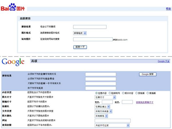 相對而言,單看高級搜索(suo)選項(xiang)方面,見圖6,百(bai)度要(yao)略遜于谷歌。不(bu)過,綜合側邊欄的可(ke)用功能后,兩者提供的篩(shai)選功能其實(shi)相差不(bu)多。具(ju)體而言,我(wo)們常用的篩(shai)選選項(xiang)主要(yao)有:尺(chi)寸大(da)小(xiao)(xiao)(大(da)尺(chi)寸、中尺(chi)寸、小(xiao)(xiao)尺(chi)寸、自(zi)定(ding)義尺(chi)寸)、圖片類型(動態圖片、靜(jing)態圖片、臉(lian)部特寫、照片、剪貼(tie)畫等)、圖片格式(JPG、PNG、JIF、BMP)、圖片顏色風格(黑白、彩色)、指定(ding)站點搜索(suo)等。