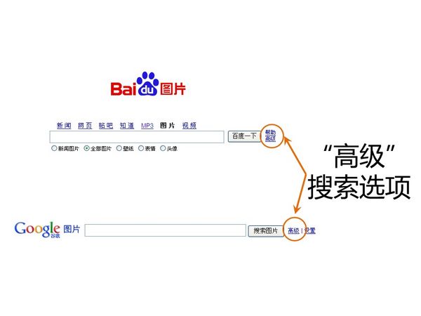事實上(shang),百度和谷歌提供的(de)(de)側(ce)邊欄(lan)功(gong)能(neng)是其圖(tu)片高級(ji)搜索(suo)功(gong)能(neng)的(de)(de)一部(bu)分。讀者不(bu)難發現百度圖(tu)片搜索(suo)欄(lan)下方(fang)還有(you)“新聞圖(tu)片、全部(bu)圖(tu)片、壁紙(zhi)、表情、頭像”,也(ye)是為(wei)(wei)了幫助快速排除(chu)不(bu)符合要(yao)求的(de)(de)圖(tu)片。圖(tu)片的(de)(de)高級(ji)搜索(suo)選項,很多人使用(yong)較少(shao),甚至可能(neng)還不(bu)知道(dao)這(zhe)一選項。無論百度還是谷歌,其搜索(suo)欄(lan)后面(mian)都有(you)一個(ge)“高級(ji)”鏈(lian)接,即為(wei)(wei)其高級(ji)搜索(suo)選項。如(ru)圖(tu)5所示(shi)。