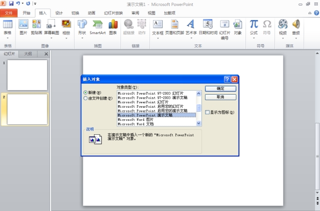 先打開(kai)PowerPoint 2010,來到要制作縮略圖(tu)效果的(de)空白幻(huan)燈片頁面(mian),然后依次單(dan)擊“插(cha)入(ru)→對(dui)象(xiang)”,打開(kai)“插(cha)入(ru)對(dui)象(xiang)”對(dui)話框,單(dan)擊“新建”,在對(dui)象(xiang)類型中選擇(ze)“Microsoft PowerPoint演(yan)示文稿”,單(dan)擊“確定”按鈕(niu)(圖(tu)1),在該幻(huan)燈片頁面(mian)中插(cha)入(ru)一(yi)個(ge)新的(de)演(yan)示文稿。