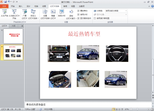 用同樣的(de)方法在幻燈片(pian)(pian)(pian)中添加(jia)其他的(de)Microsoft PowerPoint演示(shi)文稿對象(xiang),填(tian)充需(xu)要的(de)圖(tu)片(pian)(pian)(pian),直(zhi)至(zhi)把所有(you)需(xu)要的(de)圖(tu)片(pian)(pian)(pian)都填(tian)充添加(jia)完畢(bi)(圖(tu)3),這樣點(dian)小圖(tu)看大(da)(da)圖(tu)的(de)縮略圖(tu)效果就(jiu)完成了,演示(shi)的(de)時候(hou)只要單擊(ji)幻燈片(pian)(pian)(pian)上的(de)汽車(che)圖(tu)片(pian)(pian)(pian),就(jiu)自動打開該圖(tu)片(pian)(pian)(pian)的(de)全屏清晰大(da)(da)圖(tu)。