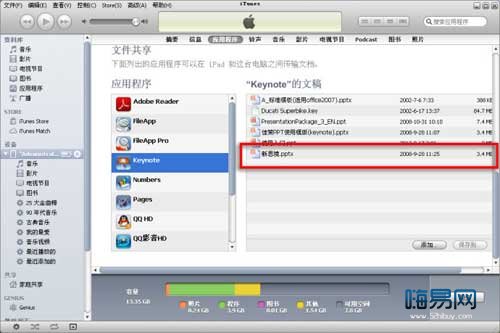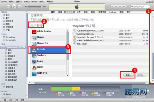 拉下itunes右方的滾動條,直到出現應用程序,找到keynote軟件,在右邊出現“keynote”的文稿,我們要把pptx文件上傳到這里,點擊右下角的“添加”按鈕。