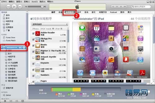 把ipad用數據線連接到電腦上,打開itunes軟件,在左邊設備中找到你的ipad,在上方打開“應用程序”選項。如下圖所示: