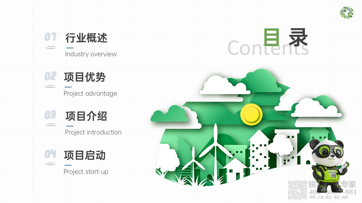 圖片與插畫搭配,如熊貓形象、城市景觀等增添趣味。字體大小層次分明,突出標題與關鍵數據,整體風格專業且富有活力,有效傳達項目信息。