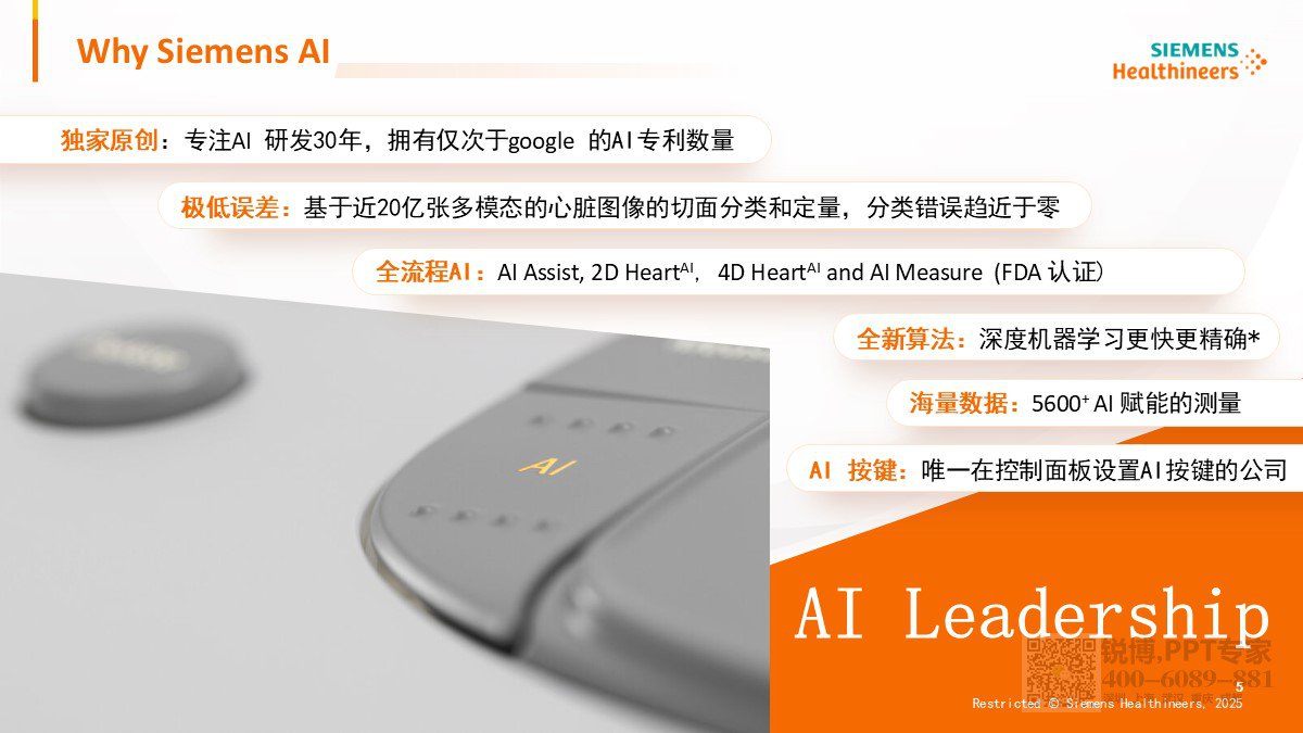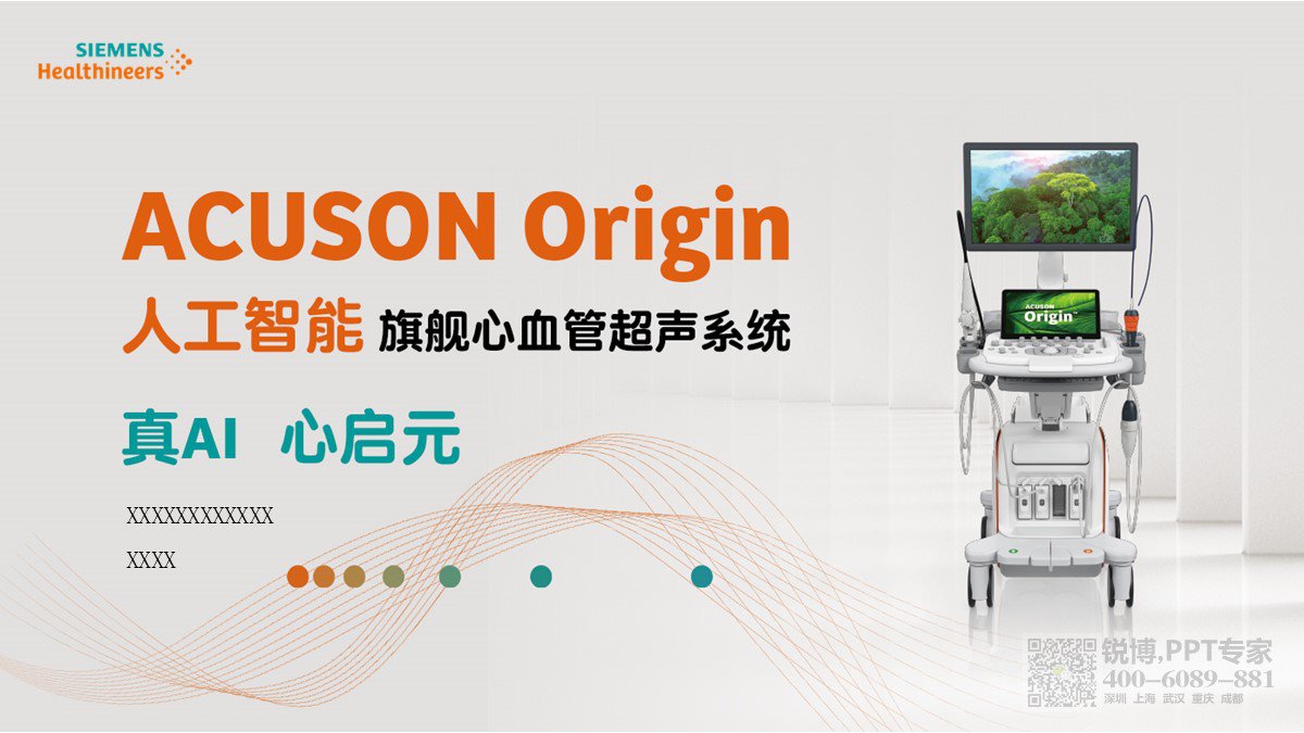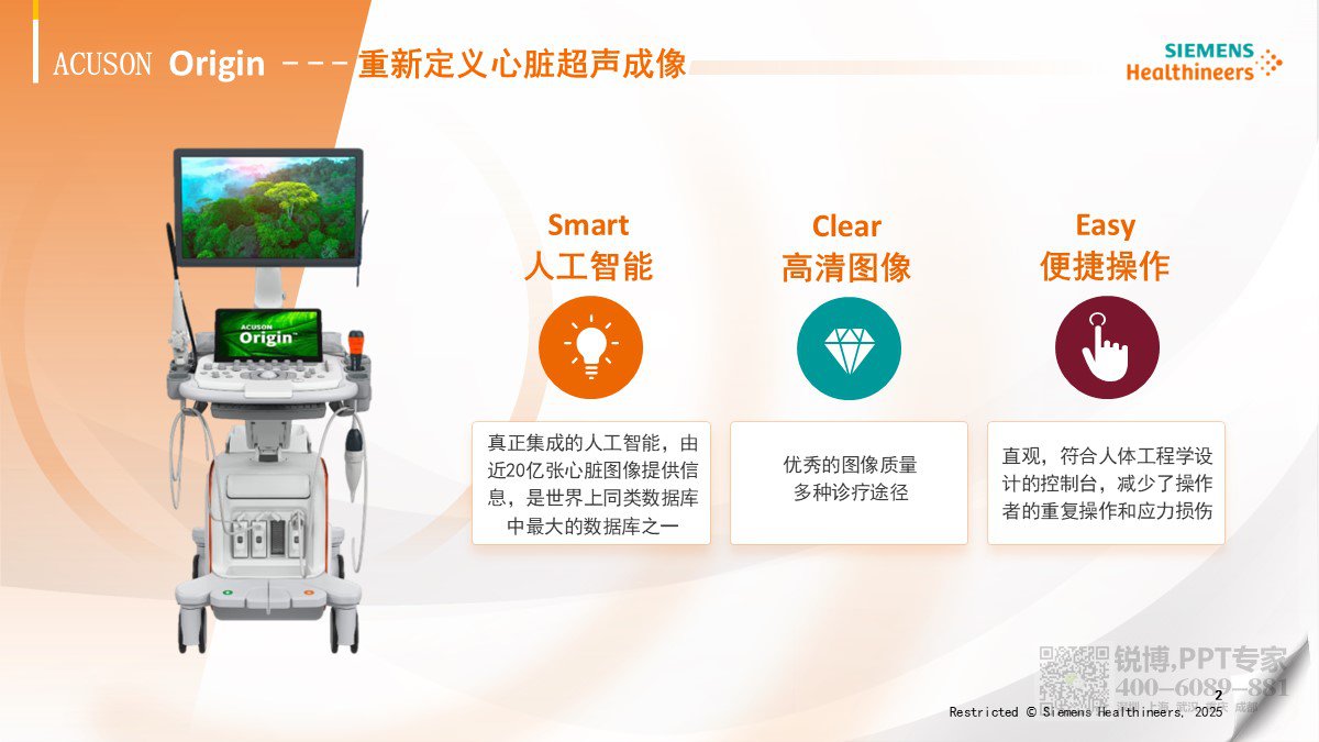設計元素包含超聲系統實物圖、探頭細節圖等,搭配簡潔圖標與文字說明,直觀呈現產品功能與優勢,整體富有科技感與現代感。