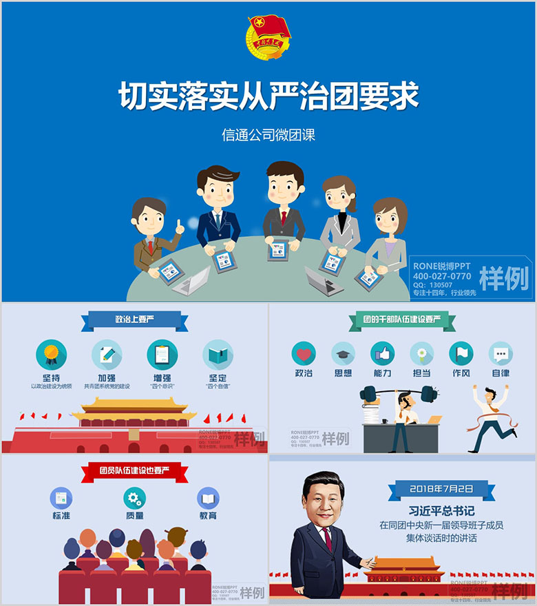 整體采用歡快活潑的卡通素材來表達主題思想。卡通人物的使用契合每頁所要表達的內容,天安門和習大大彰顯著要堅持黨的領導,緊跟黨的步伐,顏色的搭配讓整體看起來顯得沉穩,簡潔的文字配上精美的小圖標更顯檔次。