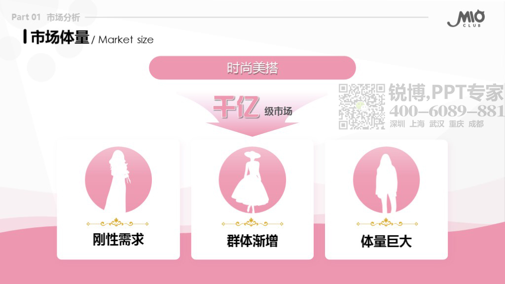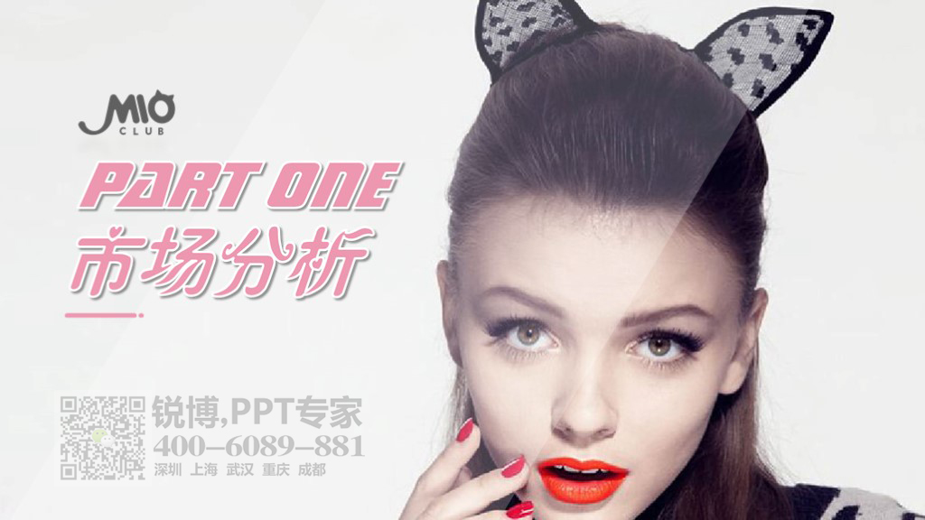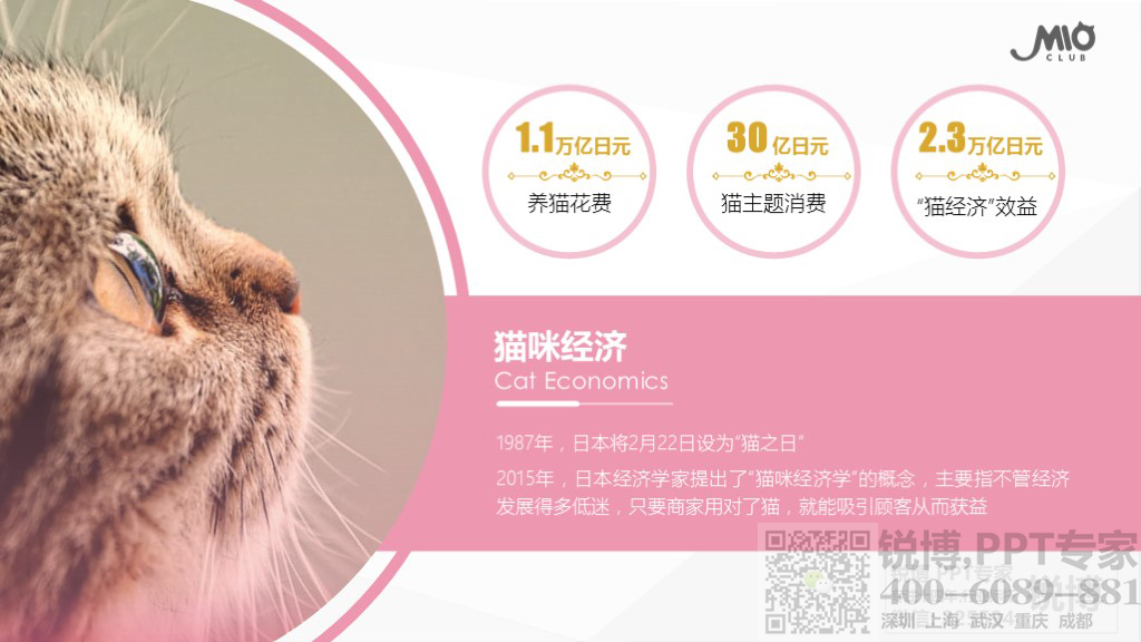 ——說明:因商業企劃書內容是由貓咪引發的商業奇想、故而選用了可愛的粉色為主色,與內容對象相符。合理的留白使畫面具有延展性,加強了文字之間的對比,突出了企劃書的核心內容與重點數據,圖片與圖形的大量使用讓畫面更加生動活潑,具有更多層次。