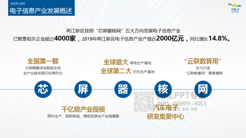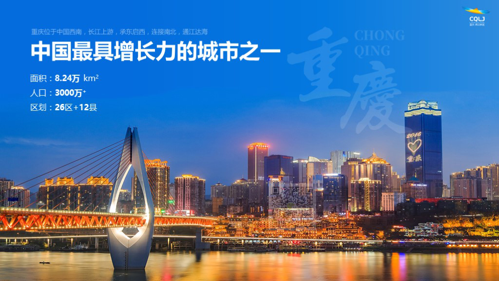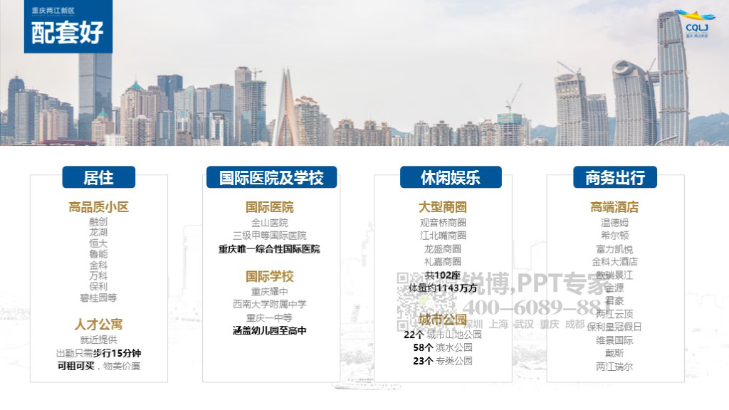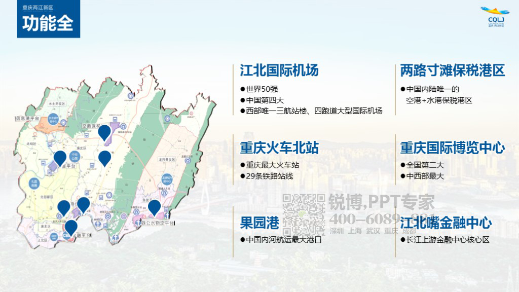 ——說明:合理的留白具有延伸視覺的效果,用藍色展示關鍵詞,突出重點清晰明了、同時藍色與白色的搭配又顯得高端大氣。豐富的配圖讓畫面更加生動,直觀的展現了兩江新區的地理面貌,讓招商書更加生動。