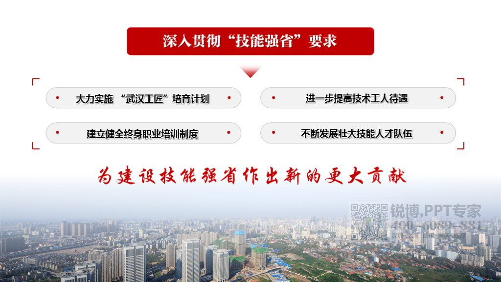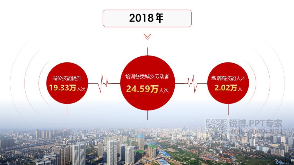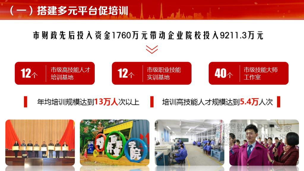 — 說明:整體采用紅色調,整體風格成穩大氣簡潔大方,簡練的文字采用圖表化的設計讓內容間的邏輯得到更好的展現可讀性更強,豐富的配圖更好的展現了工作成績,讓畫面更加生動,更具有說服力。