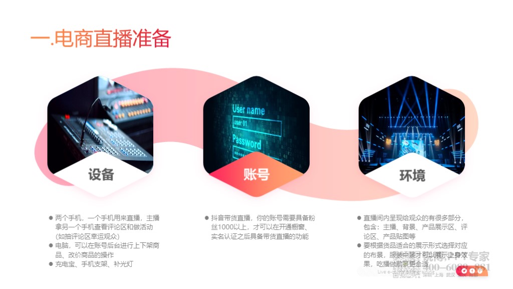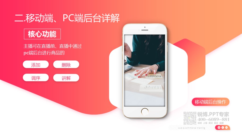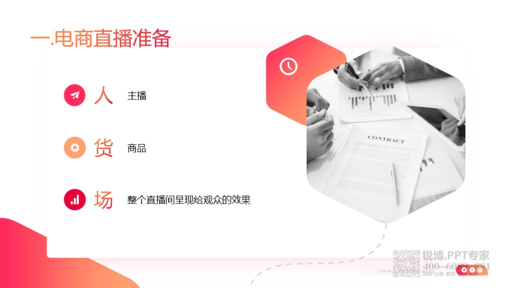 — 說明:整體采用了紅色轉橙色漸變色,整體風格給人大氣的同時,也讓人感覺很有年輕的氣息,十分符合電商直播的特性。內容的精簡給予圖片充足的視覺延展空間,搭配上漸變色彩,讓PPT更加光彩奪目的同時也不會喧賓奪主。