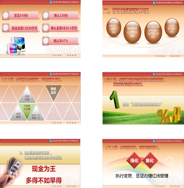 案例介紹: PPT采(cai)用紅(hong)色(se)調、漸(jian)變(bian)色(se),跟該集團的報告(gao)內容比較吻合;同時,襯以時尚紅(hong),避(bi)免(mian)畫(hua)面過于沉悶和保(bao)守;PPT的導航系統(tong)盡量做出創(chuang)意(yi),同時保(bao)證PPT的邏輯清晰和嚴謹;動(dong)畫(hua)以簡(jian)約、順暢和創(chuang)意(yi)為主(zhu),不雜亂(luan)、不瑣碎。本PPT與(yu)隨(sui)后的視頻宣傳(chuan)片(pian)相(xiang)互補充(chong),有助于活動(dong)目標(biao)的順利實施。