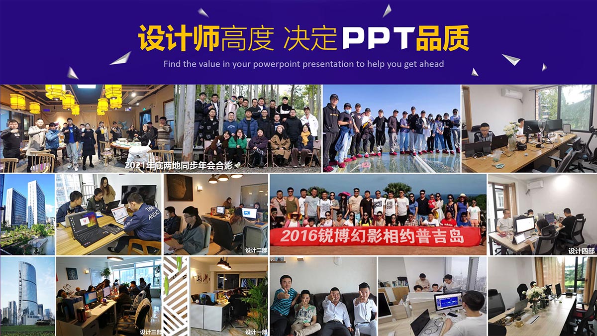 銳博PPT是面向大中華區,集PPT策劃、設計、制作、發布為一體的PPT制作公司,自擁有近三十名設計師,專門為政府、事業單位、企業、個人提供高級別路