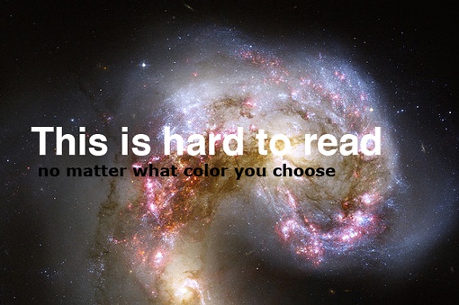 此(ci)處我們有一幅很吸(xi)引(yin)人(ren)的(de)圖像(xiang),但(dan)它對文本的(de)可讀(du)性造成了(le)損害。甚至即使我們讓字體加粗,并嘗試不同(tong)的(de)顏色,效(xiao)果也不好。對于菜鳥設(she)計師來說,這的(de)確令(ling)人(ren)沮喪。
