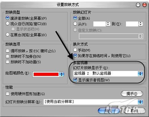 第二步:打開Powerpoint執行“幻燈片放映→設置放映方式”,在“設置放映方式”對話框中選擇幻燈片放映顯示于“監視器2”并勾選“顯示演示者視圖”項。(如圖)